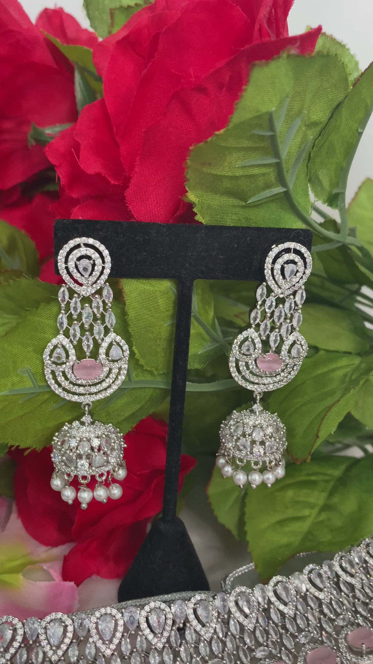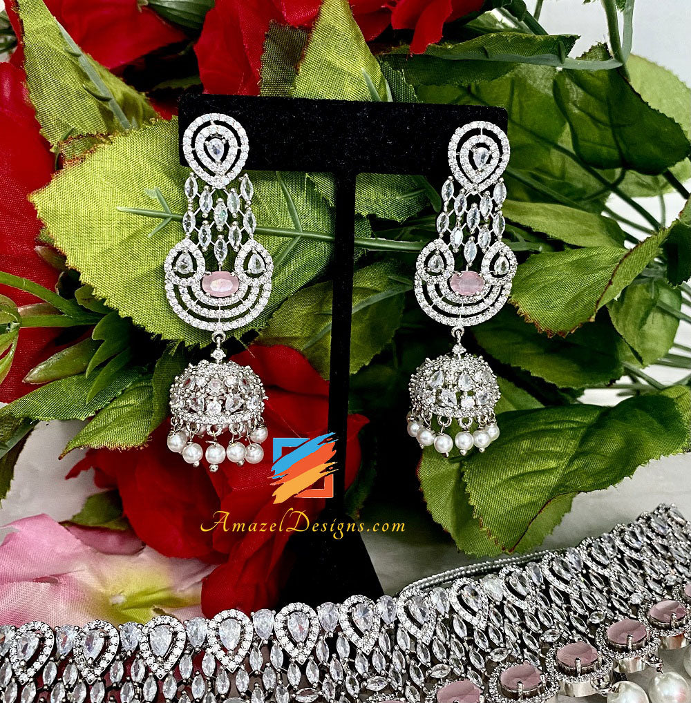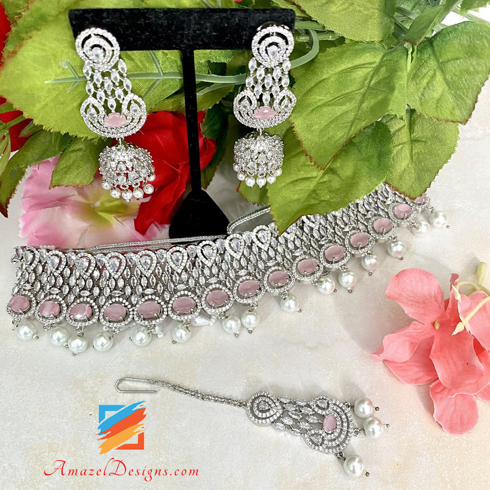 American Diamond (AD) Silver Pink Choker Necklace Earrings Tikka Set