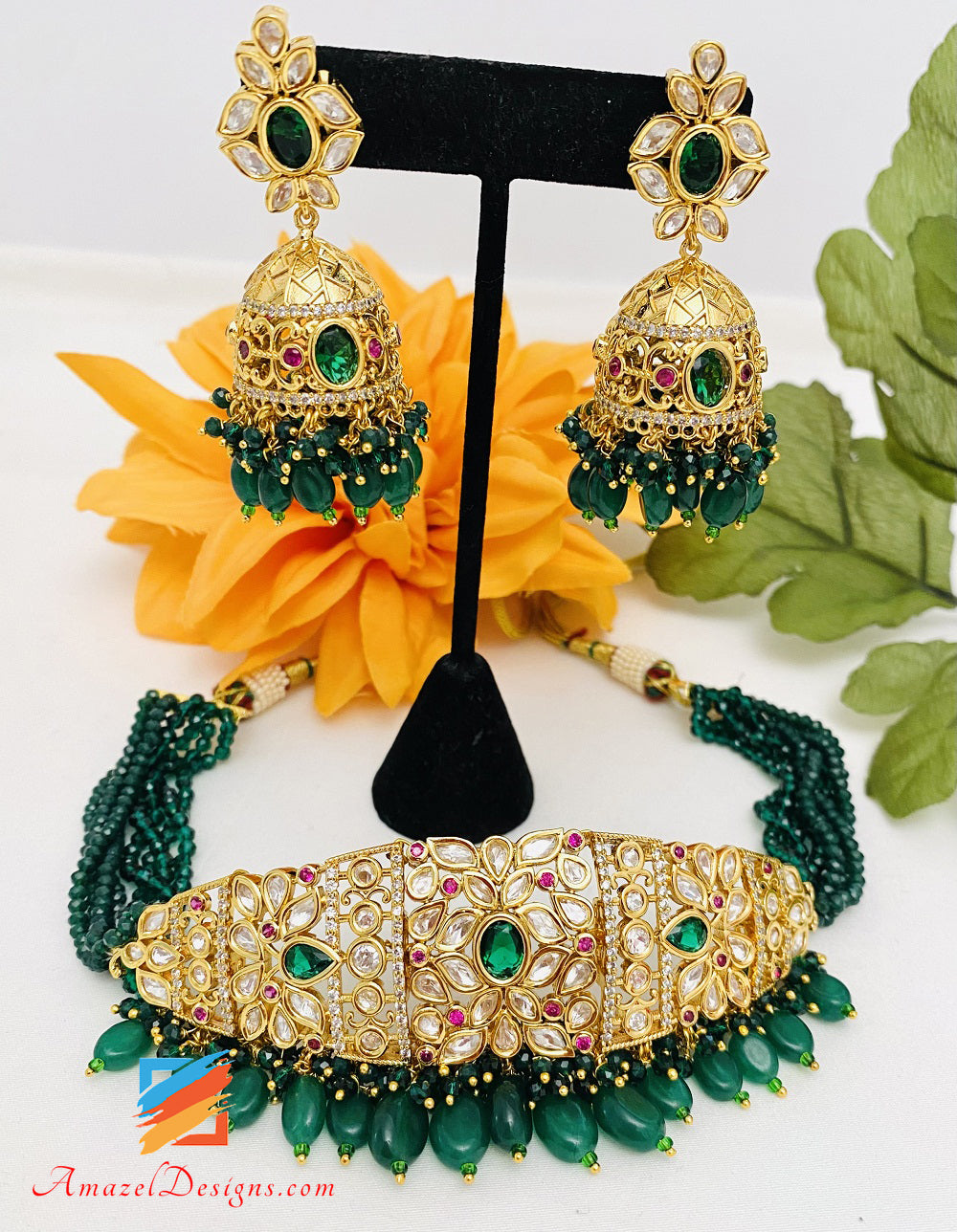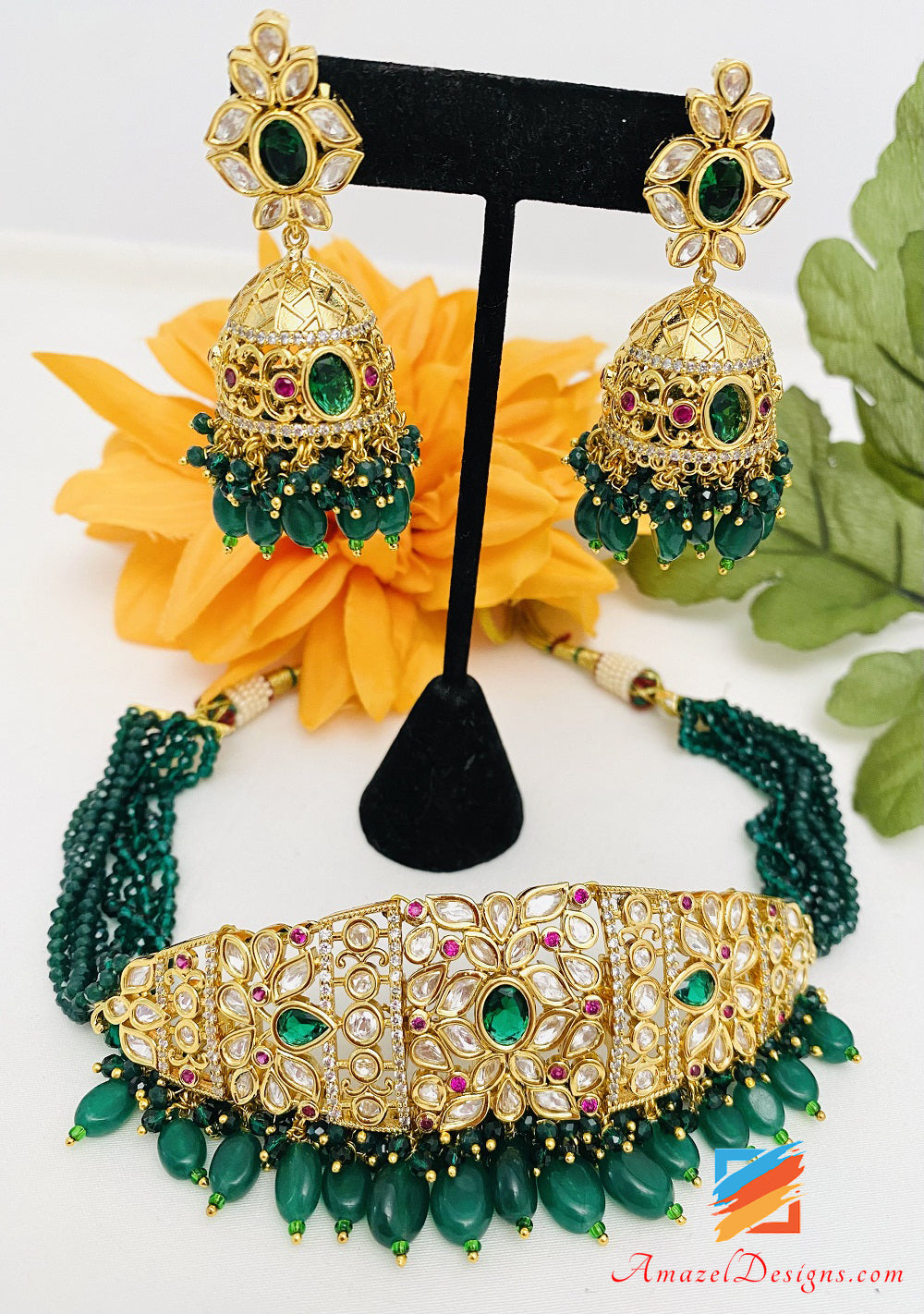Smaragdgrünes Statement Hochwertiges Kundan-Choker-Halsketten-Jhumki-Set