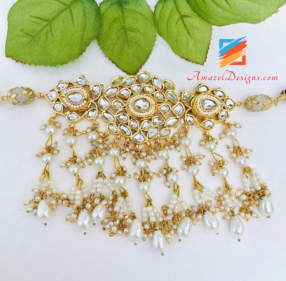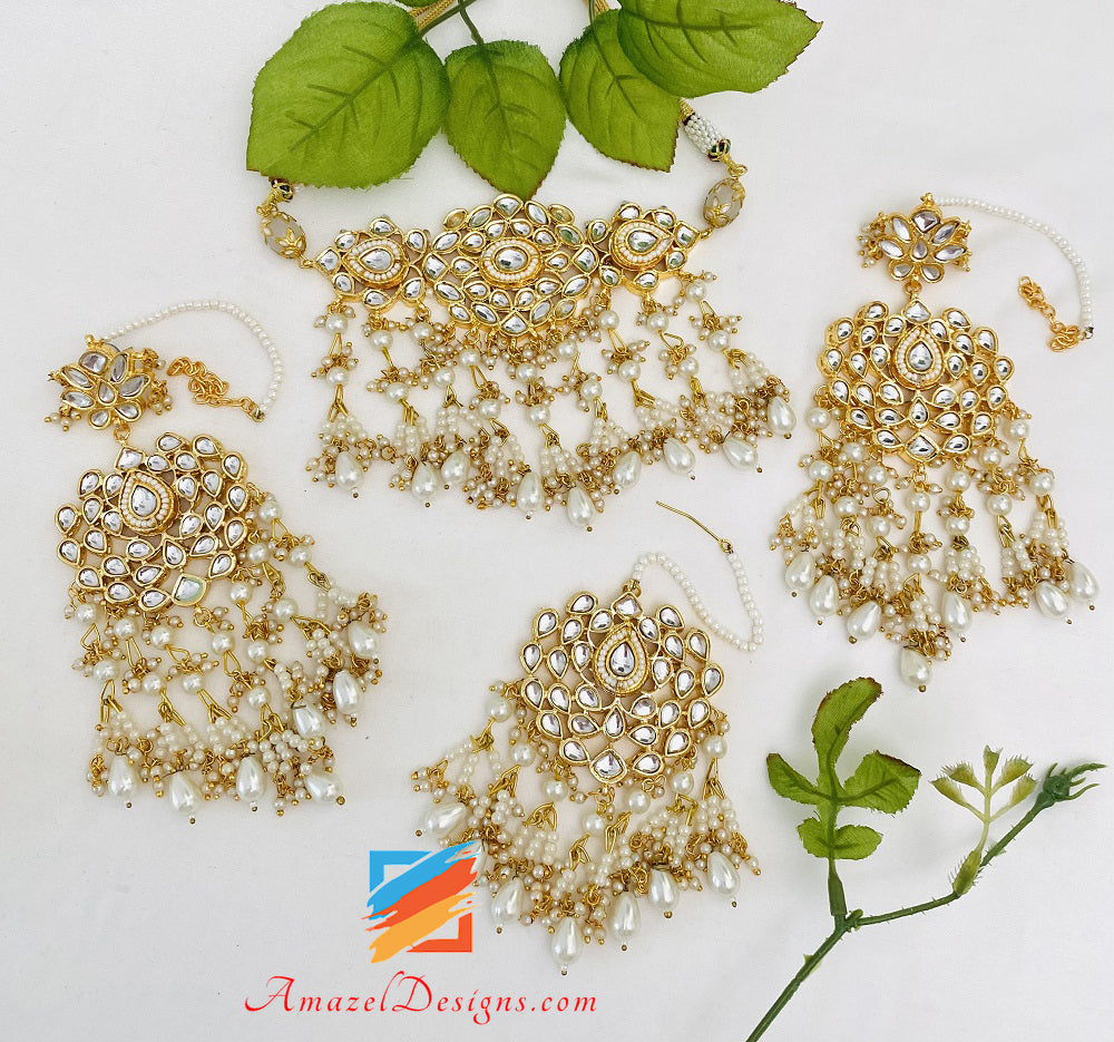 Goldenes Kundan-Choker-Halsketten-Ohrringe-Tikka-Set
