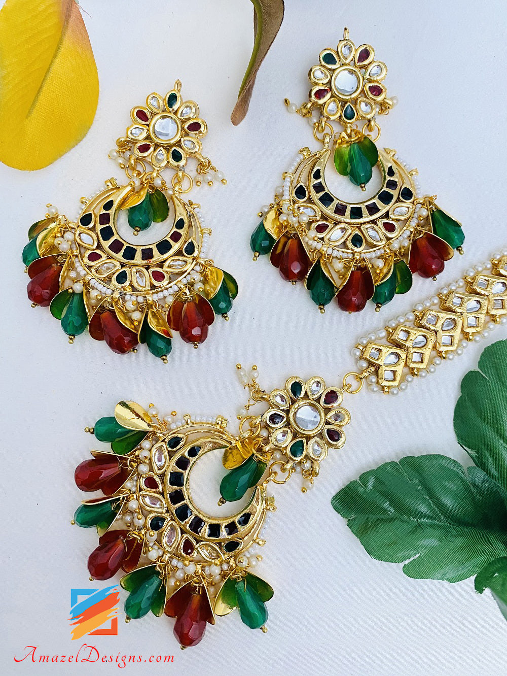 Grüner Smaragd Rubin Maroon Kundan Pippal Patti Ohrringe Tikka Set
