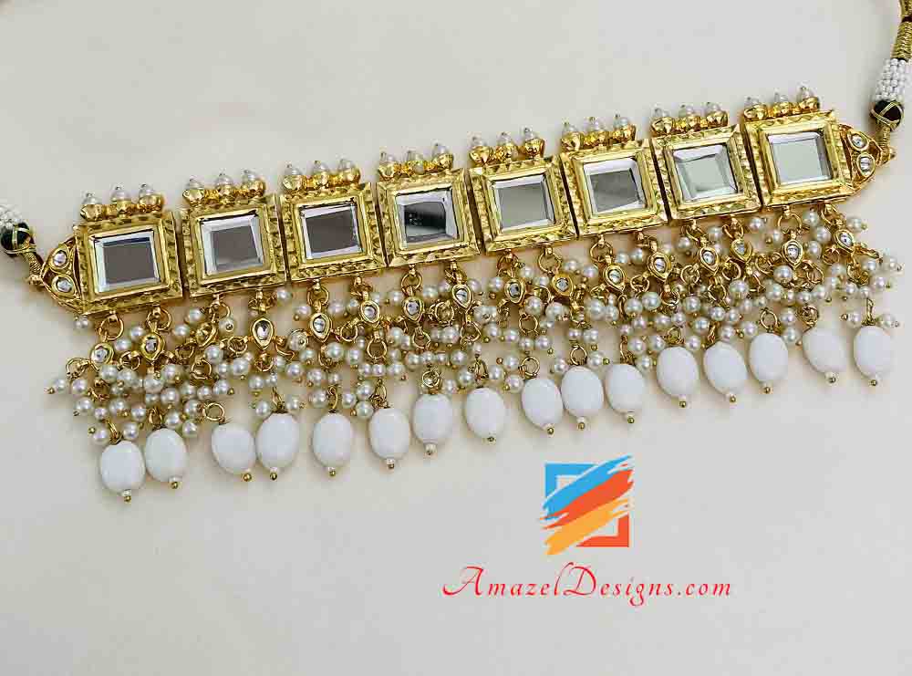 Golden Sheesha Kundan Choker Necklace Jhumka Earrings And Tikka Set
