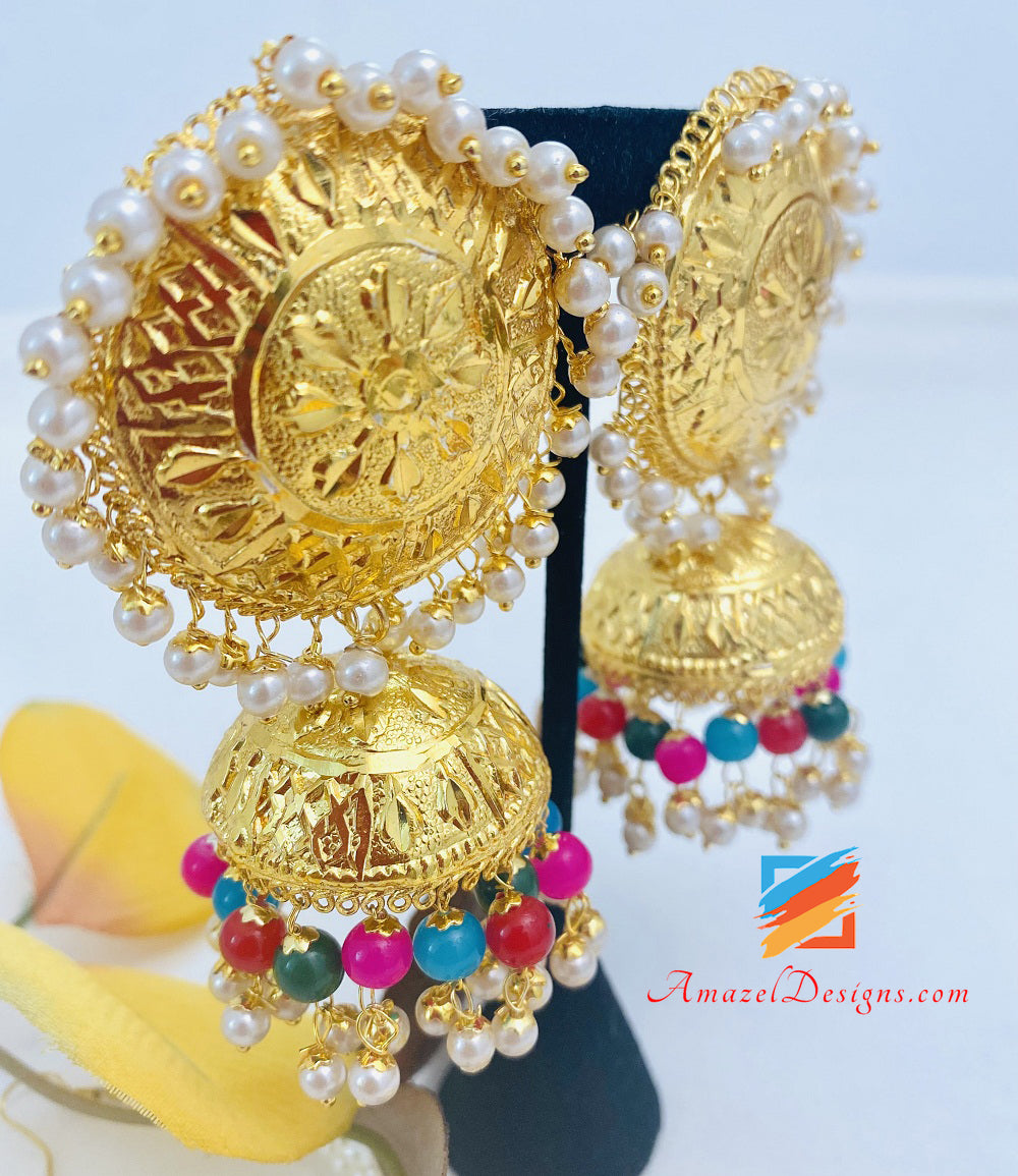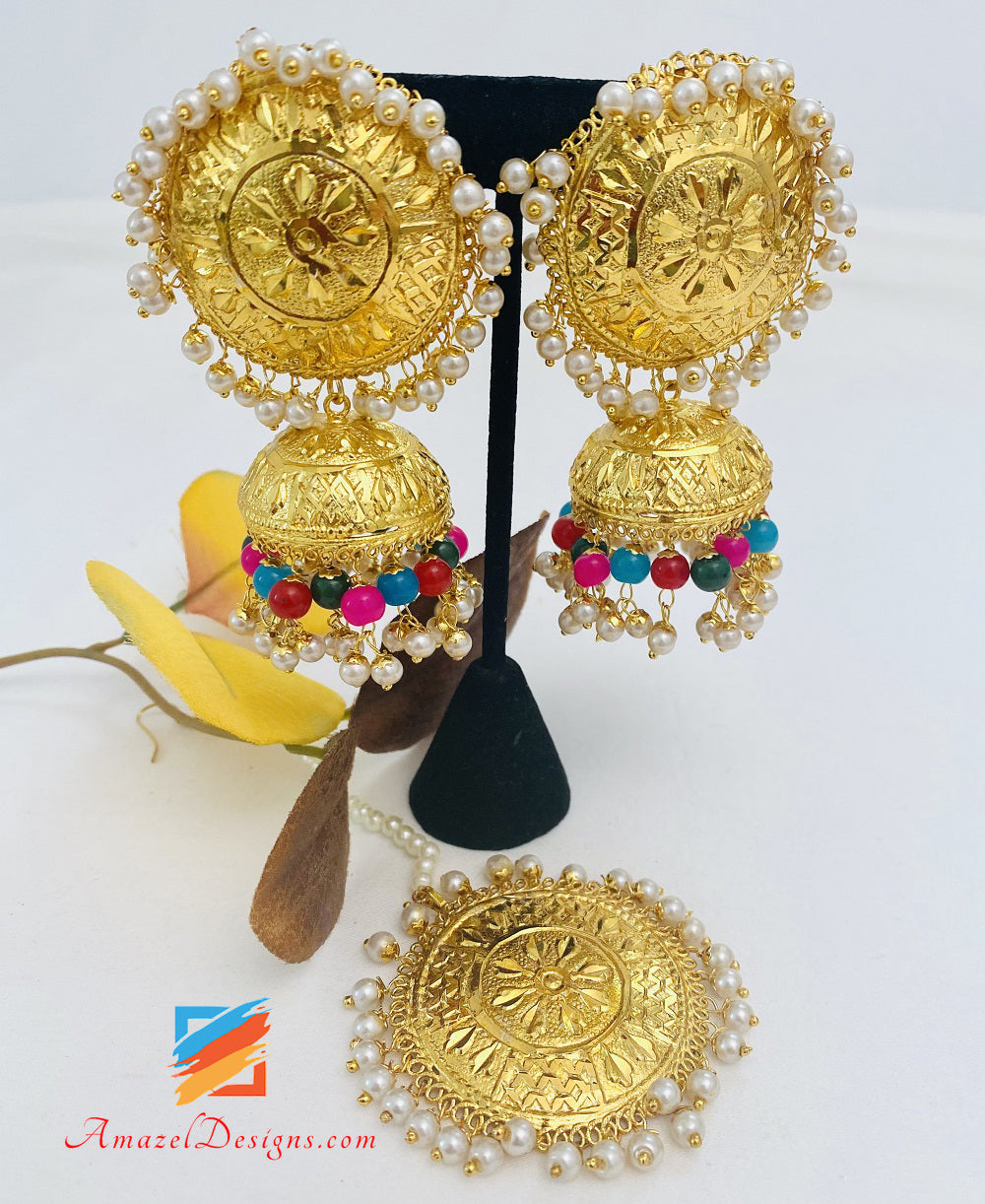 Super Lightweight Golden Traditional Multicoloured Jhumka and Tikka Set.