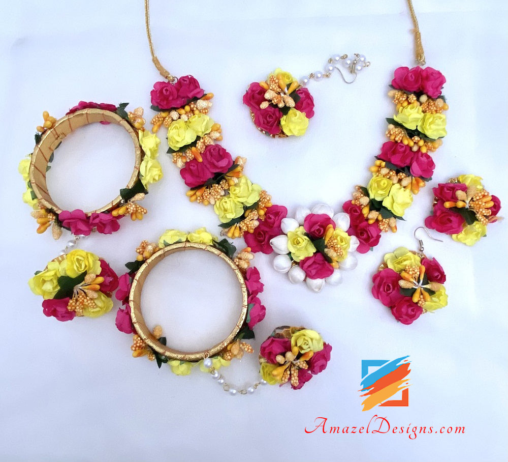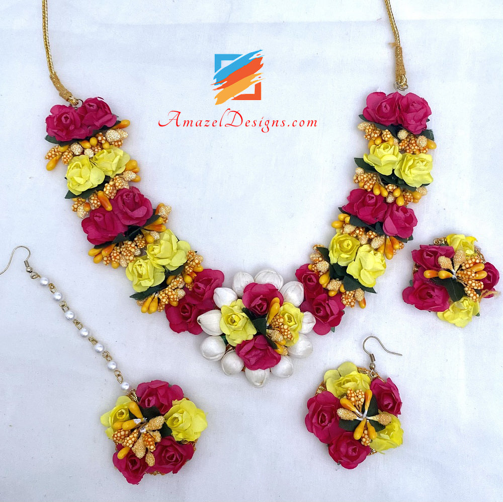 Yellow Hot Pink Flower Necklace Earrings Tikka Set